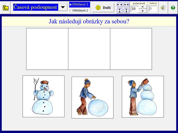 Dítě má za úkol seřadit obrázky podle časové posloupnosti. Je možné nastavit 2 obtížnosti.