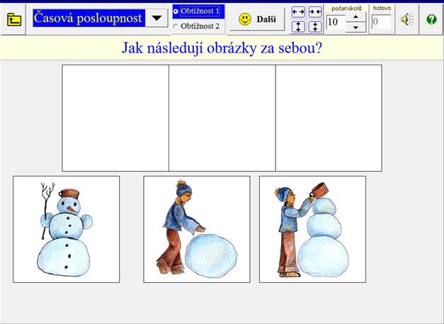Žák má za úkol seřadit obrázky podle časové posloupnosti. Je možné nastavit 2 obtížnosti.