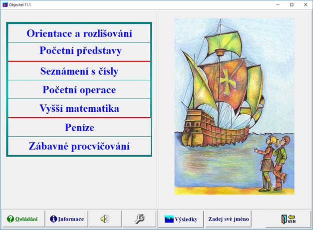 Detailní informace jsou uvedeny pod tituly: Orientace a rozlišování, Početní představy, Seznámení s čísly, Početní operace, Vyšší matematika, Peníze a Zábavné procvičování